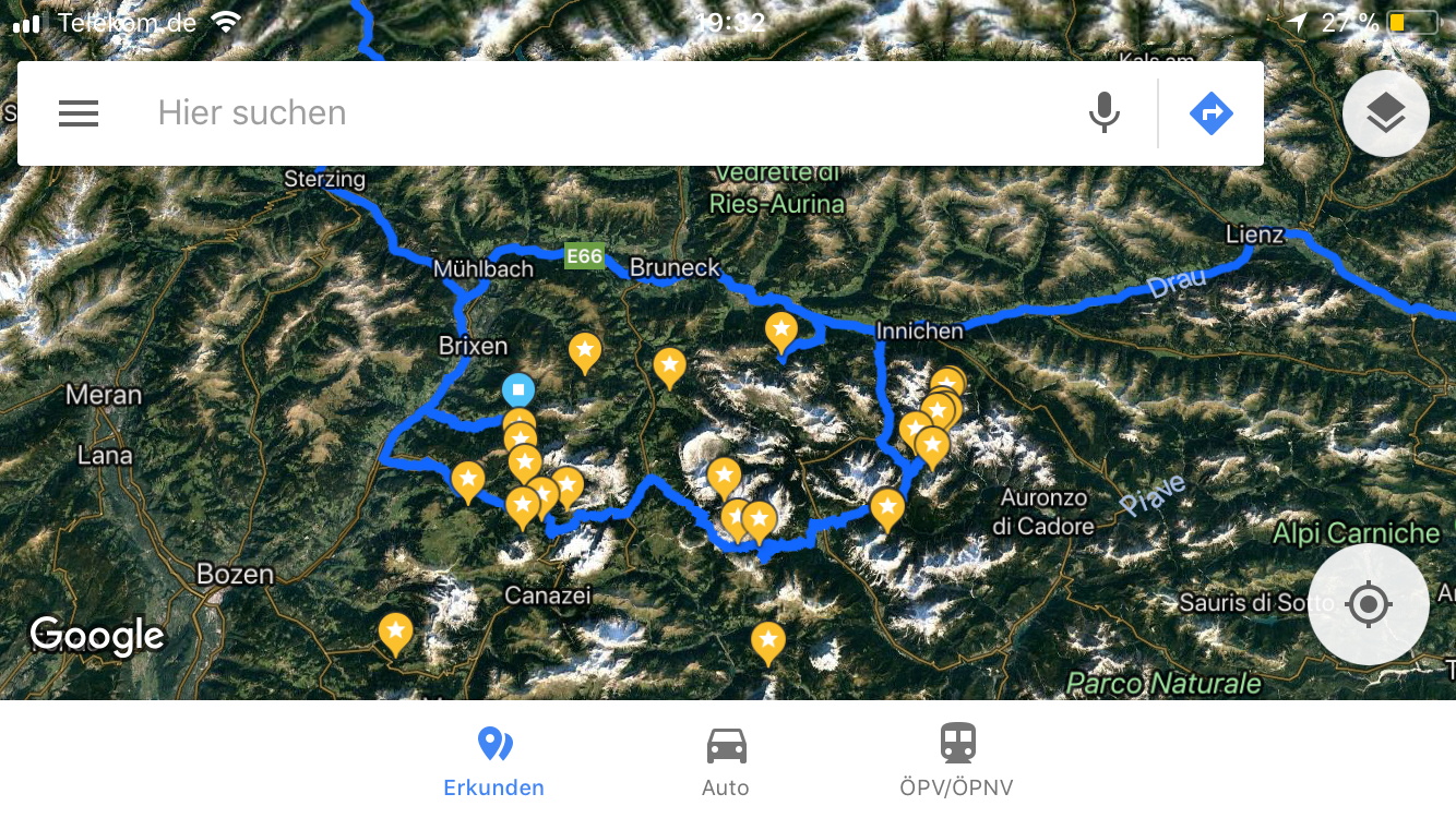 This is how my google map looked in the Dolomite area for my tour in September 2017. Every star features a point of interest. The blue line shows our driving route.